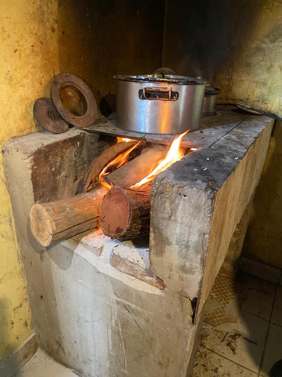 Trazando zanjones llegamos al encuentro de docentes y alumnos y un cálido fogón. Nos esperaban ardientes leños prendidos y una pava y olla hirviendo. Mezclado con el humo, allí dos mamás preparando el desayuno y las comidas con el aroma a pan casero que nunca falta.