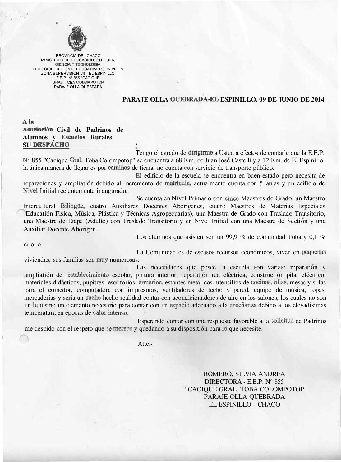 Hemos decidido apadrinar otra escuela, además de la Nº 855 de Olla Quebrada. APAER nos consultó si podíamos darles una mano… Y manos nos faltan algunas, pero el corazón...